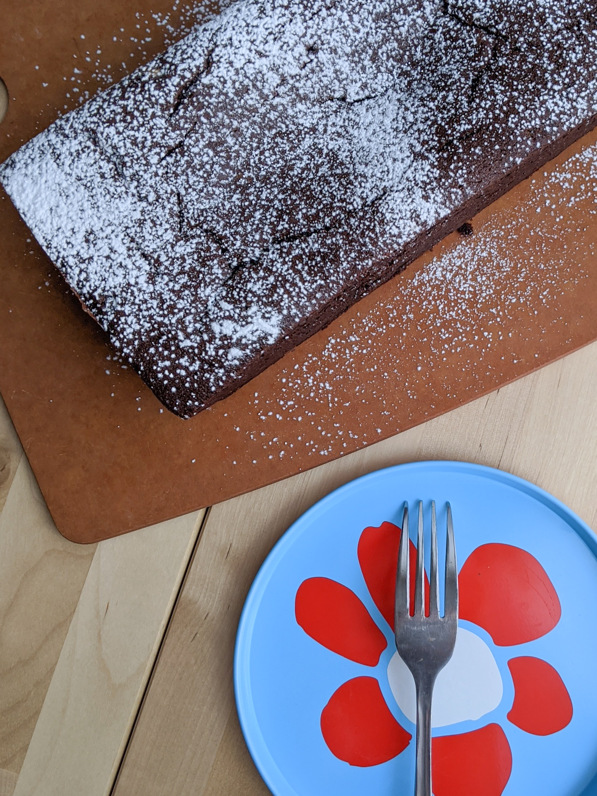 And as someone who does like chocolate cake, I’ll tell you that this is a delightful afternoon/anytime cake. If you want chocolate cake, but are tired of washing forks and need something you can just cut a slice of and eat while you go about your day, this is it. It’s perfect for this era of our lives, where the idea of “dessert” no longer exists and all food is just for whenever you want it.