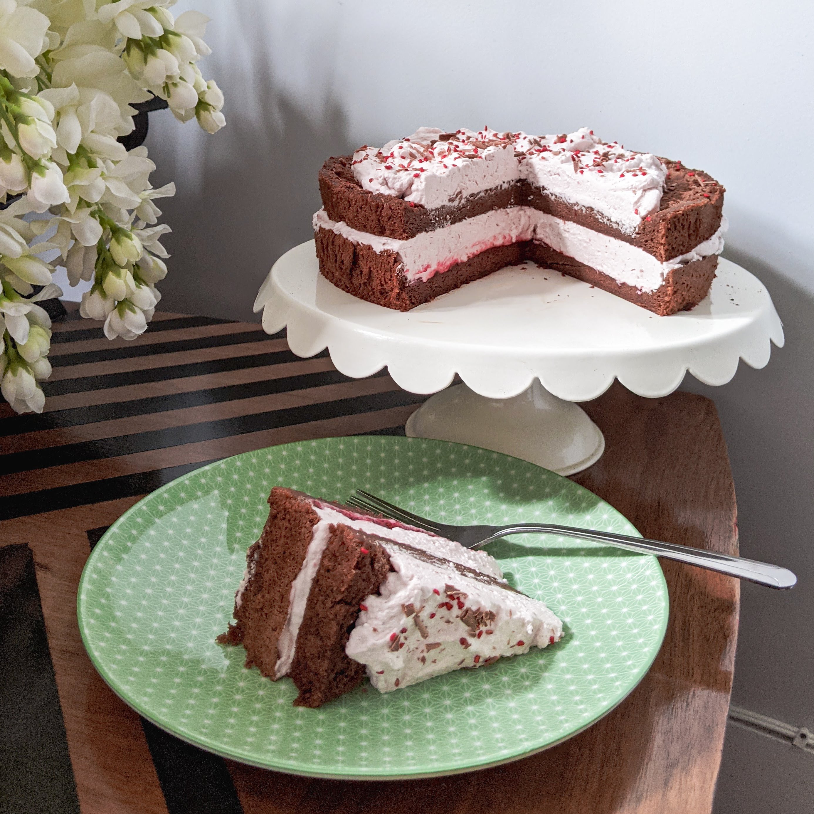 Scoop about two-thirds of the whipped cream onto the cake and spread it evenly. It should come at least to the edges of the cake—which at least in our case, were quite tall—if not even further up.