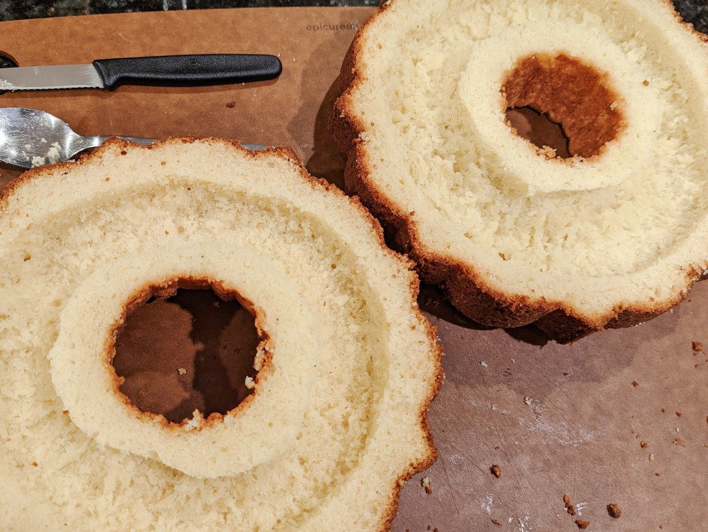 With a large serrated knife, slice the bundt cake in half. Lay each half with the interior of the cake facing up. Use a small knife to score the cake in two circles, leaving about ¾ of an inch around the outside and inside edges. (Make sure you don’t cut all the way through the cake!) Use a spoon to scoop out the middle between the two score lines, placing the cake you remove in a large bowl. Use your fingers to break down the chunks of removed cake until it resembles crumbs.