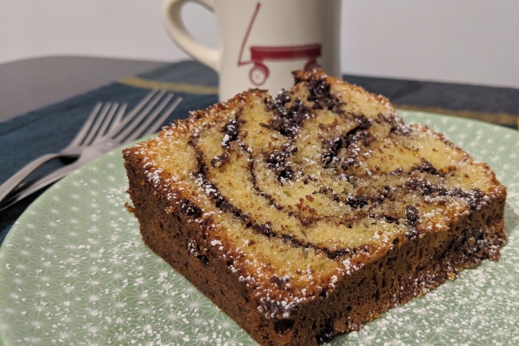This is supposed to be a coffee cake (that’s cake to have with coffee, not cake made with coffee) mashed up with a loaf of chocolate babka. Call it babka-inspired: It has chocolate filling and swirly layers, but no one is going to mistake it for the real thing.